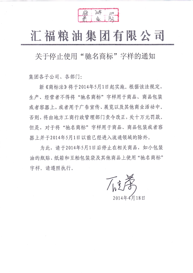 关于停止使用“驰名商标”字样的通知